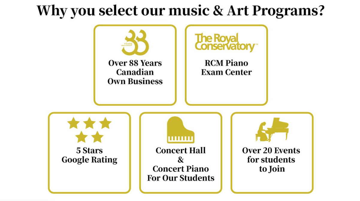 We offer a wide range of opportunities for students of all ages and skill levels. With over 20 events each year, students can participate in performances, workshops, and competitions to showcase their talents and enhance their musical journey. As an RCM Exam Center, we provide structured guidance to help students achieve their certification goals. Additionally, our after-school music and art programs ensure a well-rounded artistic education, fostering creativity and personal growth.